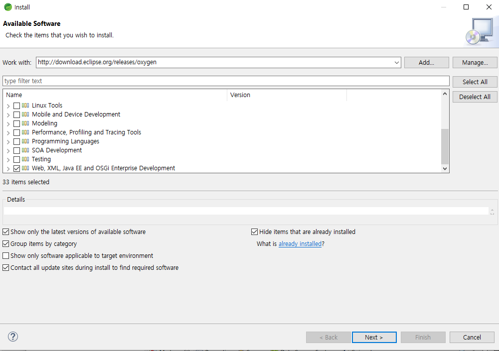 Work with에 http://download.eclipse.org/releases/oxygen (이클립스 버전을 적어도 됨) 까지 타이핑하면 목록이 생긴다.