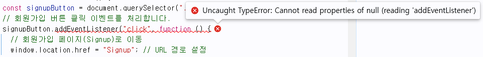 - document.querySelector(".signup_move")가 null을 반환하면 addEventListener를 실행할 수 없어 오류 발생.